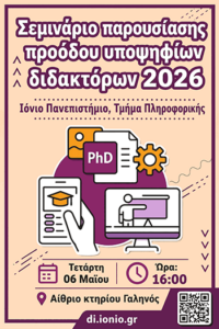 Το Τμήμα Πληροφορικής σας προσκαλεί στο σεμινάριο παρουσίασης προόδου υποψηφίων διδακτόρων που θα πραγματοποιηθεί την Τετάρτη 06 Μαΐου 2026, ώρα 16:00, στις υποδομές του Τμήματος Πληροφορικής, Πλατεία Τσιριγώτη 7 (πρώην Πλατεία Παλιού Ψυχιατρείου), στο αίθριο του κτηρίου Γαληνός.